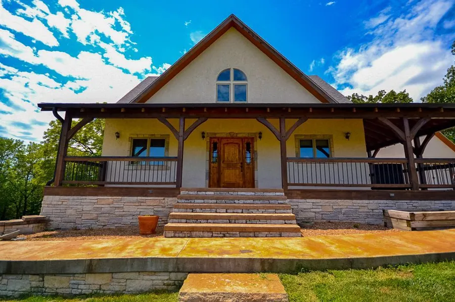 Perched high atop a hill overlooking the Turnback Creek bottoms is a home and acreage that can only be described as amazing. As you pull down the long, winding driveway, flanked by lush pasture, you’ll be awestruck at the beauty of this 3,600 square foot, 3 bedroom, 2.5 bathroom home. The home’s exterior is finished with stucco, wood accents, and beautiful stone masonry, and the interior is a dream for those who appreciate the beauty of wood and inviting spaces. Your first step through the front door will leave you speechless from the towering post & beam timber framing and soaring wood finished cathedral ceilings. Plenty of natural light streams into the open-concept living area through the wall of Pella casement windows on the home’s south side. The kitchen features granite countertops, custom cabinets, and an island with bar seating and a Jenn-Air professional downdraft gas range. Dim...