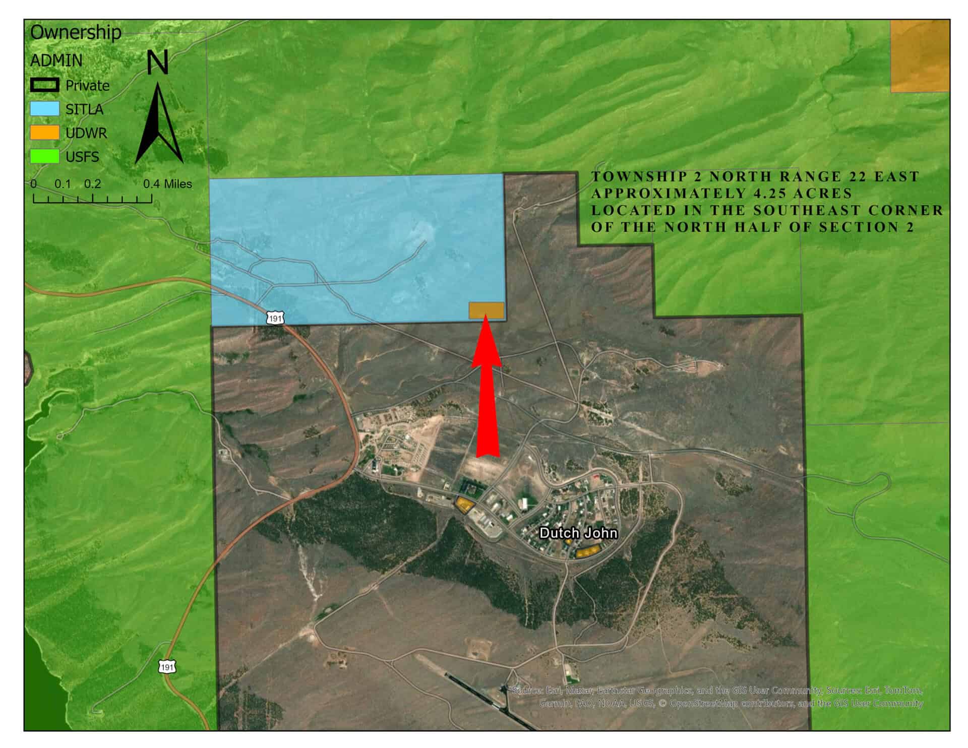 The parcel is located within the town of Dutch John in Daggett County. Dutch John is located northeast of Flaming Gorge Reservoir. The parcel is relatively flat with an elevation of approximately 6,400 feet. The vegetation is primarily bunch grasses with occasional shrubs. The surrounding properties are trust lands and privately-owned lands. The Green River, Flaming Gorge Recreational Area, and Dutch John are all located near this property.