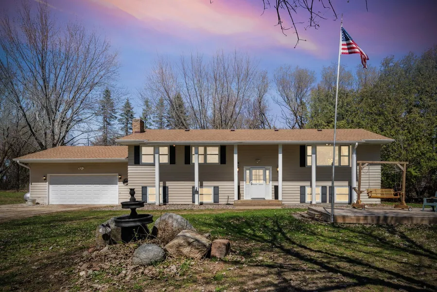 Picturesque five acres in the Lakeville school district. This 5 bedroom house is loaded with updates. The main level flows nicely with a bright living room, formal dining, and refreshed kitchen. Updated paint, flooring, and appliances. Three bedrooms up including a huge primary with attached bath and sitting room that could convert to an office, large closet, or more! Two walkouts to the deck looking out at the wooded, peaceful backyard with consistent wildlife. Head downstairs for two additional gathering spaces with new flooring and a fireplace. Huge mud room/laundry room and two additional bedrooms allow for so much living flexibility. Major updates include brand new septic system (2020), roof (2022), furnace and AC (2023), water heater (2023), and added electrical to pole barn (2020). 36 x 40 pole barn with power! Such a quiet location yet so close to the highway and major amenities.