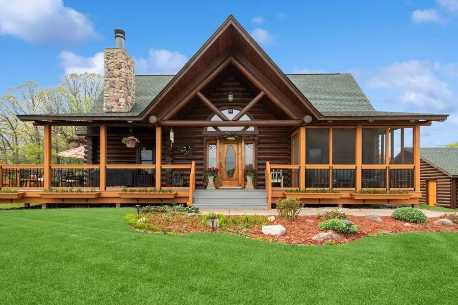 Retreat into nature while staying close to the city! This 3 bed, 3 bath, 3 car garage is set on over 2.9 serene acres, this Swedish Cope design log home is true town and country living. Enjoy the outdoors from the comfort of your very own sanctuary. Take a sauna or make s'mores over a crackling fire in the wood burning fireplace. Relax in the screened-in porch, in the four-season porch, or on the wraparound deck. Spacious front lawn is level, just right for yard games or playing with kids and pets. The back woods make a great hideaway for a mini-camp out or cross-country skiing. Located on a cul-de-sac with no through traffic, you can rest easy when it comes to safety and privacy. The property also offers endless entertaining options. Great Room features an open beam 25ft cathedral ceiling with gorgeous tongue and groove pine.