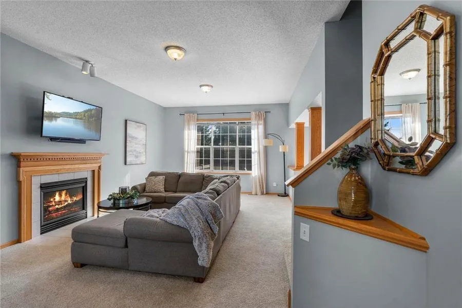 Set on a desirable corner lot in a quiet neighborhood near Lakeville South High School, this beautifully maintained 4-bedroom, 4-bathroom home offers a perfect balance of comfort, style, and functionality. Inside, a bright and open living room welcomes you with 10-foot ceilings, new carpeting, and a cozy gas fireplace framed in tile. The seamless layout flows into the dining area, where decorative pillars, rich wood flooring, and statement lighting create an inviting atmosphere. Sliding glass doors extend the space outdoors to a freshly stained deck, ideal for dining and gatherings. The kitchen combines timeless style with everyday function, featuring wood flooring, a center island, and a spacious 4x4 pantry, while a nearby half bath and a convenient mudroom/laundry with sink, shelving, and garage access keep daily life running smoothly. Upstairs, the primary suite offers a private retreat with a walk-in closet, ceiling fan, and ¾ bath with dual vanities, while two additional bedrooms share a full bath. The newly finished lower level (2024) adds a family room with an entertainment center, a bar area with wood block counters and tile flooring, a fourth bedroom, and a ¾ bath—perfect for guests or entertaining. Outdoors, enjoy a fully fenced backyard and a three-stall garage with tandem bay for extra vehicles, storage, or a workshop.