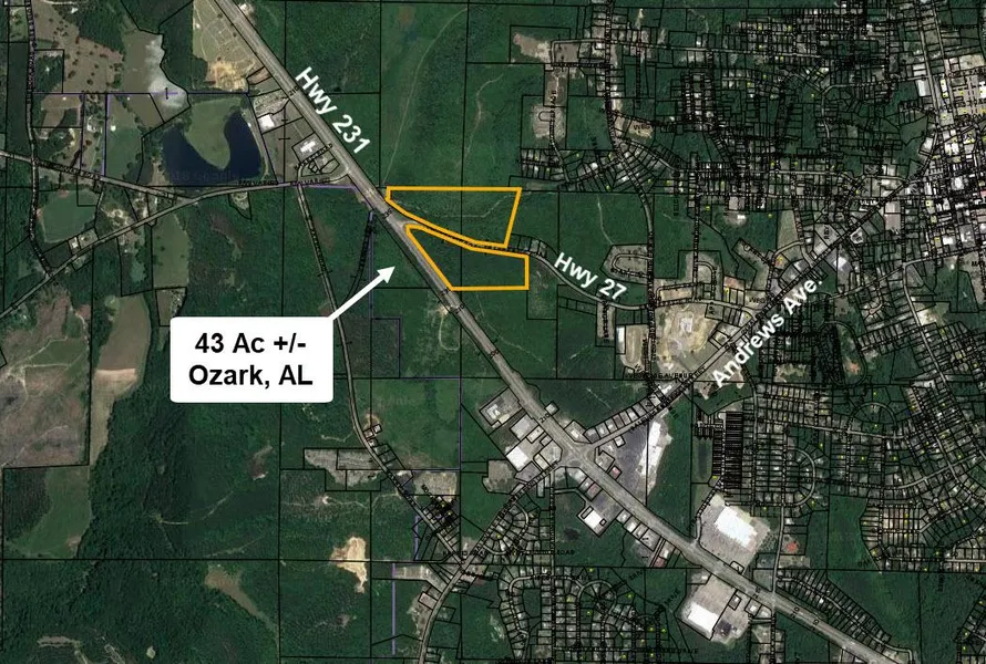 This site consists of two parcels containing 43 acres (+/-) located at the intersection of Hwy 231 and Hwy 27 in Ozark, AL. It features approximately 1,375 frontage on Hwy 231 and 1,740 frontage on Hwy 27 (1,430 on both sides of Hwy 27). There are several options for future use including commercial applications and single family or multi-residential opportunities. Currently zoned R-H (Rural-Holding), the average daily traffic count on Hwy 231 is 18,200 (ALDOT 2016). Offered at less than $5,000 per acre.