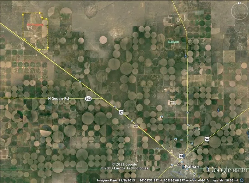 Full Description: Located northwest of Dalhart approximately 15 miles on Hwy 87. Property fronts the highway on the north side. Total acres of 3,445 with 375 acres of corn and 500 acres of wheat, balance of acres are dry land and grass. There are 7 wells pumping a total of 1,600 gpm. Property has potential for additional wells.