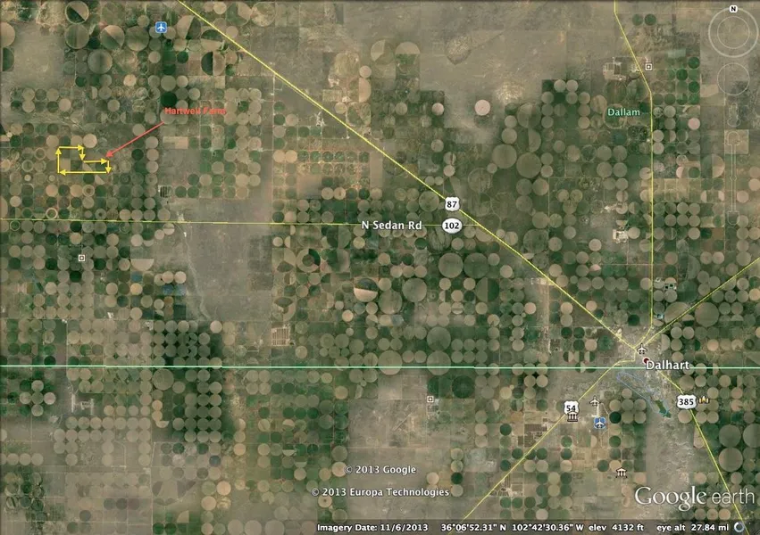 Full Description: 960 acre farm west of Dalhart with 740 acres irrigated from 10 wells, 3 sprinklers. This farm has a diverse crop mix with 185 acres of corn, 185 acres of triticale for seed; 247.5 acres of wheat and 122.5 acres of sorghum sudan for seed. Nice efficient farm, give us a call for more information.