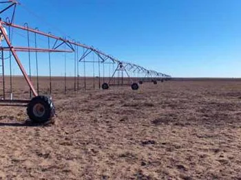 This 334.56 +/- acre farm has approximately 800 ft of frontage on US Hwy 87 and would be a good location for a dairy. There are two 70-acre circles that are irrigated with one towable Reinke minigater sprinkler system. The sprinkler system is nozzled at 300 gpm and water is supplied by 2 wells. One well is 220 ft deep with a 3’ submersible electric pump supplying about 100 gpm. The second well is 180 ft. deep and produces 200gpm from about 150 ft with a 6’ turbine pump powered with a Chevy 292 engine on natural gas. A 4” plastic line connects the two wells and 8” plastic lines run to both pivot points.
