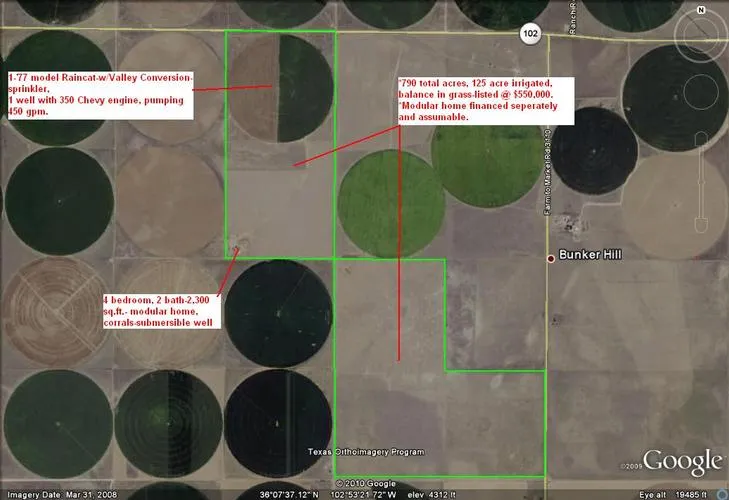 This unique property offers the opportunity to get started with a circle-and water for 1/2 corn or summer crop and 1/2 wheat for winter crop. If your looking for a set up to run or straighten out cattle-this could be a good fit. With access to the property from 2 sides that are Farm to Market Road-pavement. There are 790 acres total in this property and it is listed at $550,000. This property also has some corrals and a 4 bedroom 2 bathroom 2300 sq ft home, that is financed seperatly, but assumable. Home site has a submersable 1 1/2 hp well for house and cattle. Irrigation equipment incudes a 450 gpm well, with a 350 Chevy engine and 1-77 model Raincat sprinkler with valley conversion.