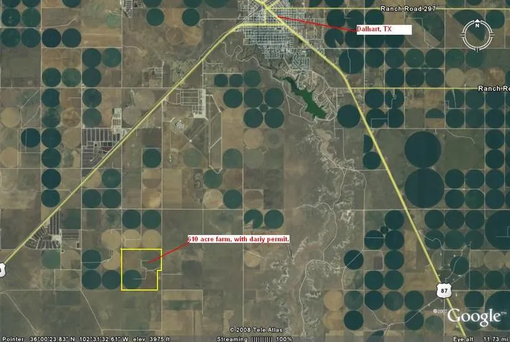 610 acres in this irrigated farm located approximately 7 miles southwest of Dalhart. There are 4 circles, 4 pivots and 4 wells on this farm with highway frontage and a dairy permit. This property includes the existing wheat crop and manure applied on the corn ground.