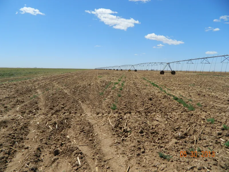 Improvements: Improvements include 4 irrigation wells equipped with two 200 horsepower natural gas turbine pumps, one 150 horsepower natural gas turbine pump and one 3-inch electric submersible pump. Three center pivot irrigation systems are located on the property, one half mile pivot and two quarter mile pivots. The half mile pivot is nozzled at 1,200 g.p.m. and the two quarter mile pivots are nozzled at 300 g.p.m. The center pivot irrigation systems, irrigation motors, gear heads and cooling jackets are owned by the tenant farmer and are not a part of this offering.