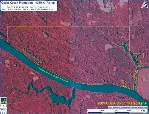 This beautiful Alabama River tract has 2.5 miles of river frontage, and an additional 0.5 mile of frontage on Cedar Creek, with a private boat launch on Cedar Creek. There are approximately 860 acres of mature bottomland hardwood and 330 acres of intensely managed loblolly pine plantations, much of plantations being currently mechantable. The breakdown on the plantations is as follows: 130 acres of 28-year old PP, 89 acres of 23-year old PP, 75 acres of 12-year old PP, and 35 acres of 11-year old PP. The interior road system is excellent, and the tract features over 6 miles of these roads.