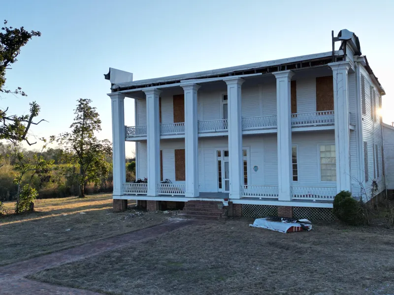 The antebellum home, a product of meticulous craftsmanship, embodies the elegance and opulence characteristic of the pre-Civil War South. Its neoclassical design features a symmetrical faade adorned with towering columns, each bearing witness to a century and a half of Southern history. The exterior, once a pristine display of white, now bears the scars of the recent tornado, but even in its damaged state, the home commands attention a...