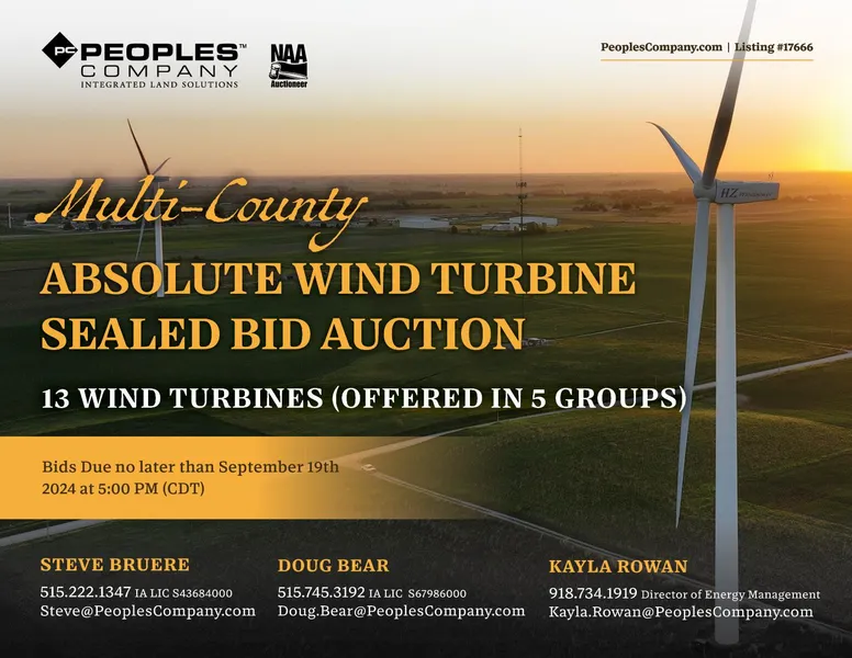 Absolute Sealed Bid Auction for 13 Wind Turbines - Thirteen HZ wind turbines, distributed across Dallas (3), Story (2), Cerro Gordo (5), and Delaware (3) counties in Iowa are available for purchase through an Absolute Sealed Bid Auction. All sealed bids are due before 5:00 PM (CDT) on Thursday, September 19th, 2024. The winning bidder will be purchasing the turbines, interest in the land easement, and will get assigned Power Purchase Agreement combined with all future income generated by the 13 HZ wind turbines. In addition, there are nearly $479,000 of tax credits available for the 7 tax eligible wind turbines and when some of the turbines come back online or repaired, there may be additional incentives available.