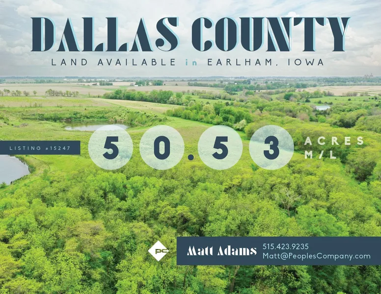 A rare and highly sought after opportunity in Dallas County 50.53 acres m/l located just off pavement and 15 minutes from the Des Moines Metro. The property is located immediately northeast of Earlham, Iowa on 365th Street with easy access to Interstate 80 and Co Hwy F90. Site would work well for an acreage/homesite in the Earlham School District or a weekend getaway. The property offers a private driveway that meanders through a timber to a high spot with great surrounding views. Improvements include electric and rural water services being located at the road. Warren Rural Water District services this area and has a 1 in. water line located on the north side of 365th Street. There are no covenants on this land and the location is outside of the City Limits so the uses shouldnt be as restricted.