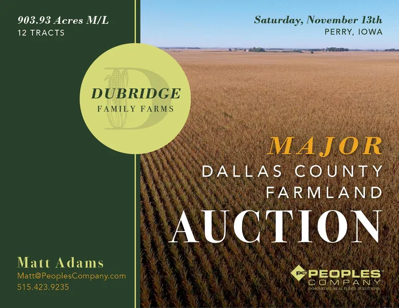 Major Dallas County, Iowa Land Auction Mark your calendar for Saturday, November 13th, 2021 at 10:00 AM! Peoples Company is honored to represent Dubridge Family Farms, LLC in the sale of 903.93 total acres m/l of prime Dallas County, Iowa farmland carrying a CSR2 rating of mid-to-high 80's!