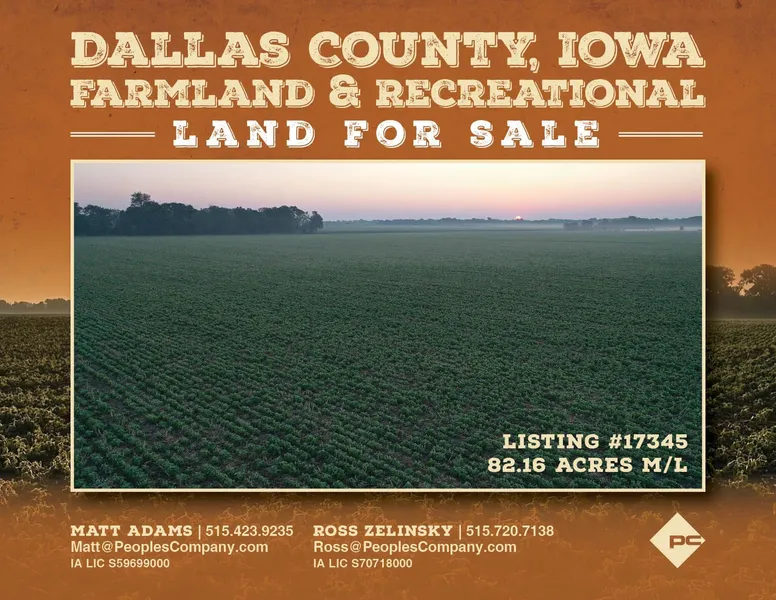 Peoples Company is pleased to present this excellent 82.16 acres m/l pasture and tillable combination farm in Dallas County, Iowa. Located approximately one mile north of Dawson, Iowa on County Road P46 / D Avenue, this farm includes 82.16 gross acres m/l with 49.8 tillable acres on the southern end of the farm that is currently in soybean production carrying a CSR2 rating of 72.4. The primary soil types of the tillable portion of the farm include Spillville loam, Hanlon fine loam, and Cylinder loam. The balance of the farm is currently pasture, comprised of cool-season grass pastures. There is plenty of shade, and the exterior fences are in good condition for all types of grazing livestock.