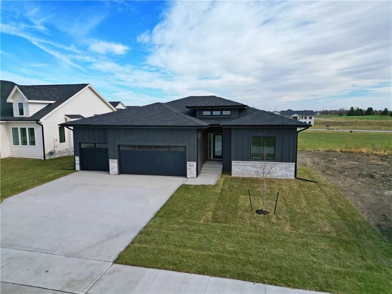 Introducing Cosgriff Development's Modern Ranch with hip roof elevation & over 2400 SqFt of finish! This stunning ranch boasts an open concept great room to kitchen & dining area. The kitchen features white cabinetry with a black accent island, quartz countertops, tile backsplash, under cabinet lighting, stainless steel appliances including gas stove & range hood vent, a walk-in pantry, & is right off of the covered deck perfect for summer cook-outs & entertaining. The family room offers oversized windows for plenty of natural light plus a gas fireplace with custom trim surround & built ins with white oak floating shelves. The large owner's suite offers an en suite bathroom with dual vanities, full tile shower with semi frameless glass door, & large walk-in closet with access to the laundry room. Rounding out the main level is two additional bedrooms, full bathroom, & mudroom off the 3-car garage with custom built in drop zone with white oak bench. Downstairs you'll find a finished daylight basement with second family room, wet bar, guest bedroom, full bathroom, & additional unfinished storage area. Upgrades include: 9' ceilings, insulated garage doors, upgraded belt driven garage door opener motors with integrated cameras, upgraded plumbing/light fixtures, & more! All of this wrapped up in a location close to schools such as Radiant Elementary & Northwest Waukee High School & convenient location to amenities such as Kettlestone, the future Target location, & Waukee Hy-Vee.