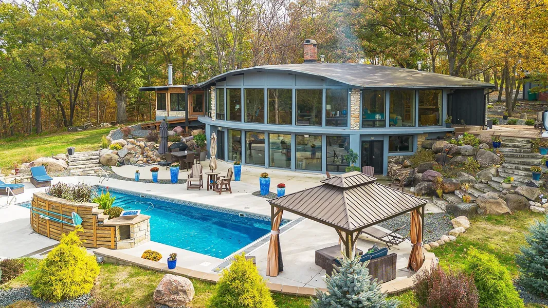 Executive retreat on nearly 4-acres of wooded land just a quick jump from the metro. This architectural marvel has a mid-century design with locally sourced woods and limestone. In addition, you will find custom alder cabinetry, unique brickwork, and amazing stone archways. You will find floor-to-ceiling windows across the back of the house overlooking your wooded land and fantastic pool area. Enter the home through double doors where you will find a beautiful, brick spiral staircase, large kitchen, dining room, amazing great room with wood ceiling and custom fireplace; and a sunroom that is surrounded with new Pella windows, unique fireplace, heated tile floor, bookshelves, and a stunning wood ceiling. Also on the main is the private primary suite filled with windows, dressing room, bathroom with both jetted tub and tile shower, and a walk-in closet. Descend to the lower level through the beautiful spiral staircase to a gorgeous wet bar with all the appliances needed to entertain, two additional bedrooms and a full bathroom. Perhaps the most amazing part of this unique property is on the outside. Amazing pool area surrounded by patios, covered pergola, two water features, fire pit, separate deck area with hot tub, and a nearby shed for all your pool equipment and toys. Over 4,300sf of living space, 3 fireplaces, concrete construction, geothermal heating/cooling 'a one-of-a-kind masterpiece in your own private wooded sanctuary.