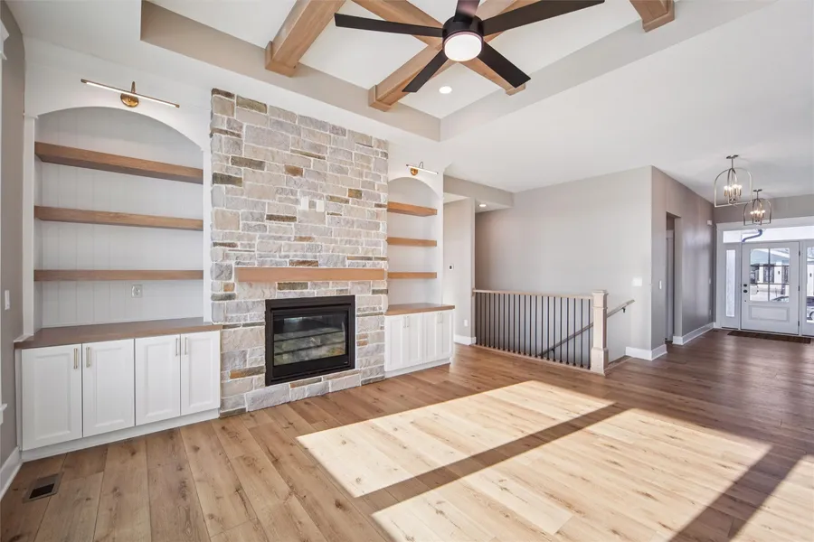 Another fantastic property from DAN Homes! Over 3200sf of finished living space with all the quality and stylish finishes that you have come to expect from DAN. This property features 5-beds/3-baths atop a walkout lot backing to greenspace. Main floor has premium LVP throughout. Inviting family room with tray ceiling, beautiful wood beam accents, and stone fireplace feature wall with built-in cabinets and lighted shelving. The large kitchen has quartz countertops, tile backsplash, under cabinet lighting, soft close cabinets/drawers, stainless steel appliances, hidden walk-in pantry, island, and a dining area that leads to a sizeable maintenance-free covered deck. Primary bedroom with tray ceiling, walk-in closet, ensuite bath with beautiful tile shower & large dual vanity. Two more bedrooms, full bath, drop zone, and laundry room complete the main. Finished walkout lower level includes 2nd family room, 2nd fireplace, wet bar, two bedrooms, full-bath, and plenty of storage. Walkout to covered patio & backyard. 4-car insulated garage with insulated doors & quiet belt drive openers, irrigation, custom closets, solid core doors, and casement windows. All information obtained from Seller and public records.