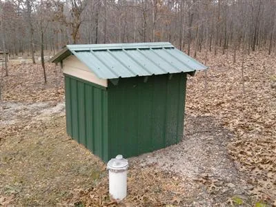 Secluded wooded land with a well, travel trailer, storage building, and piers for a house already in place.