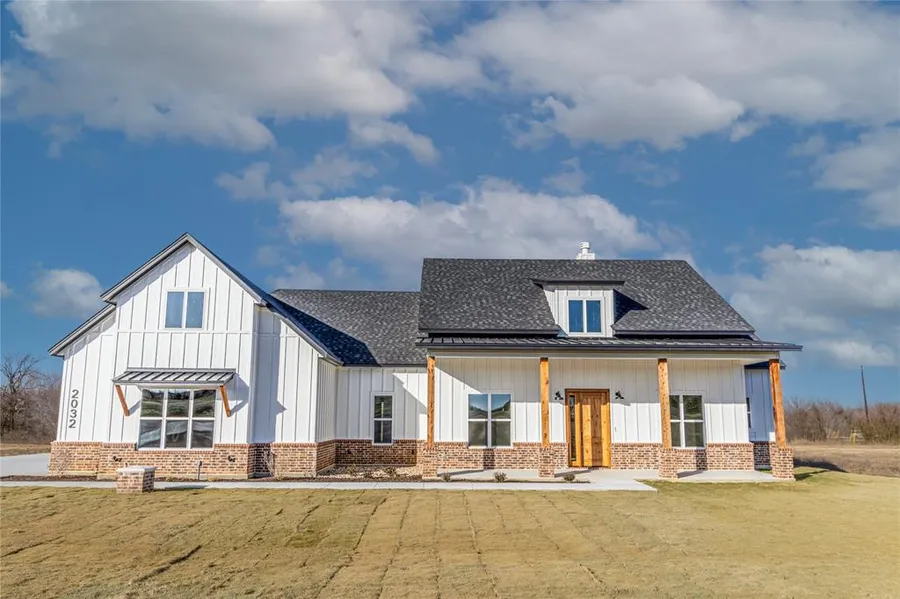 This 2.287 ac property features extraordinary craftsmanship & luxurious finishes throughout. Open concept living with bright natural light flowing through gallery windows in living & dining areas overlooking massive backyard. Stunning cathedral style beams adorn the vaulted ceiling. Bold black brick wood fireplace hearth meets modern shiplap to ceiling with floating cedar mantle wired for TV. Large kitchen features SS appliances, oven & microwave combo, farmhouse sink & massive pantry. Electric cooktop is framed by floating shelves and shaker white cabinets. Bold black island with quartz countertops throughout entire home. Expansive primary bedroom & elegant bathroom with soaking tub, dual vanities & WIC leads to large laundry room with sink. Three additional bedrooms share large full bath with private toilet & shower room. Den can be used as 5th bedroom, office or flex space! This home is in the heart of Peaster ISD's newest community, where country life meets luxury living.