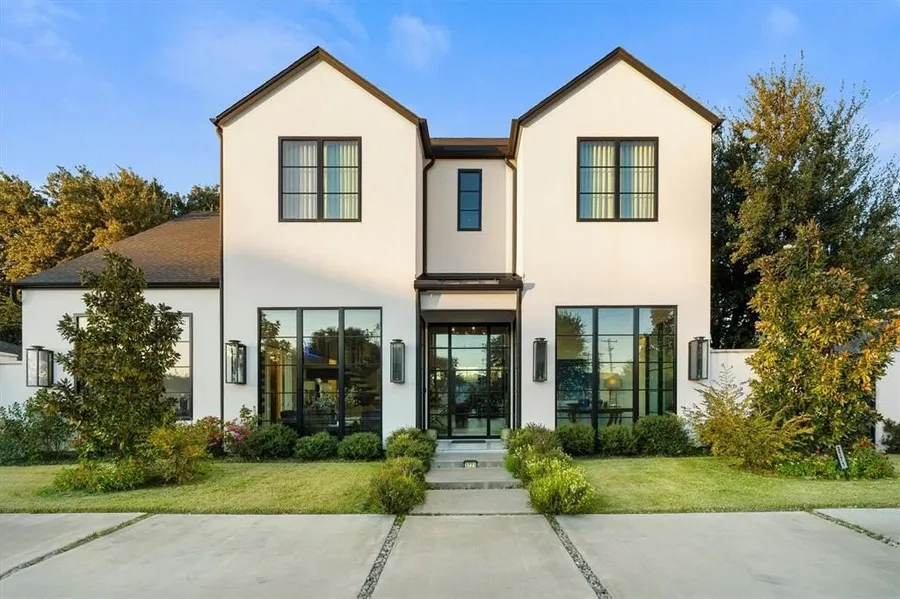 A luxury Midway Hollow two-story Transitional -Modern home with white Stucco on a corner large private fenced lot with clean lines, custom metal and glass windows and Entry doors allowing natural light throughout along with 7” white oak floors. Electric front shades allow for privacy.