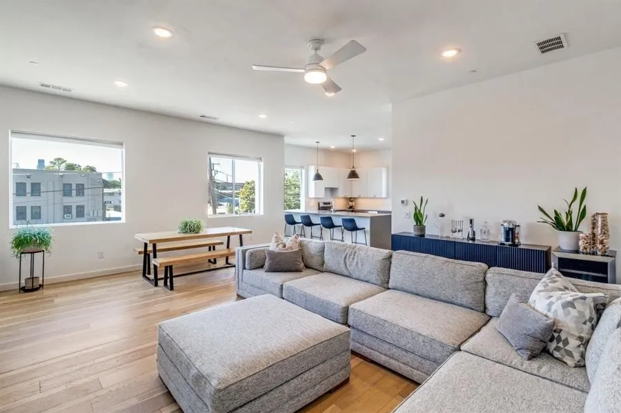 Welcome to this beautiful modern three-story townhome, conveniently located minutes from Lower Greenville in Dallas, TX. This stunning property boasts two spacious bedrooms and 2.5 bathrooms, offering ample space for comfort and relaxation. The open floor plan, combined with tall ceilings and large windows, allows for an abundance of natural light, creating a bright and inviting atmosphere. The kitchen is a chef's dream, equipped with stainless steel appliances, granite counters, a kitchen island, and custom tile backsplash. The home also features hardwood and tile floors, recessed lighting, and custom cabinets, adding a touch of elegance to the overall design. The in-unit laundry adds convenience, while the security system ensures peace of mind. The property also includes a two-car garage and central heat-air for your comfort. The highlight of this townhome is the rooftop deck, perfect ...