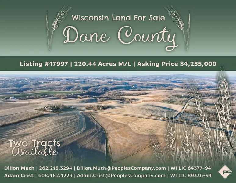Peoples Company is pleased to present an exceptional opportunity to acquire 220.44 m/l acres of prime farmland in Dane County, Wisconsin. Conveniently situated just minutes from Mount Horeb and Highway 151, this highly productive farm features 188.51 FSA cropland acres with an impressive Productivity Index (PI) of 57.6. The dominant soil types on the property include Dodgeville and New Glarus silt loam, which have consistently produced strong yields.
