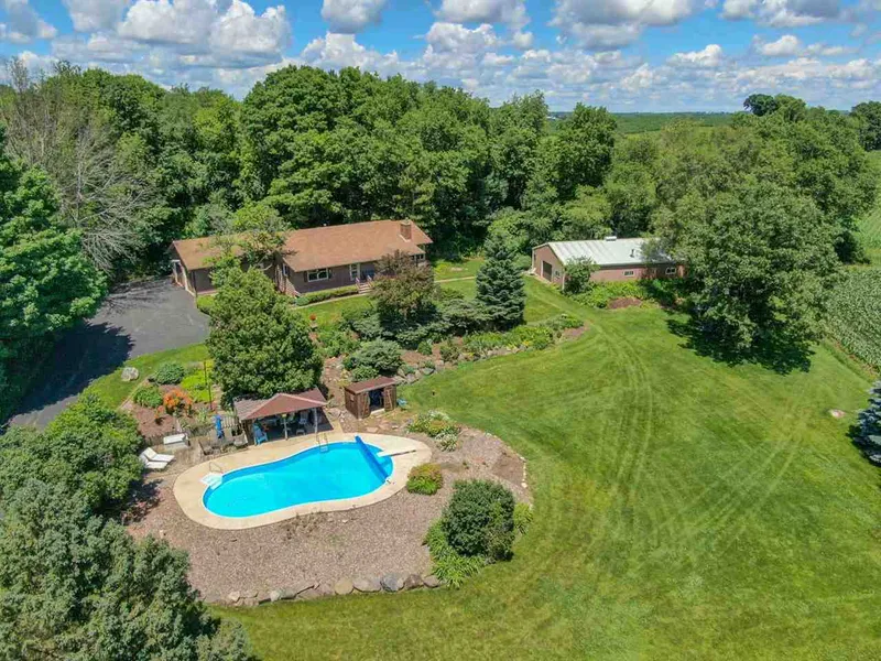 PRIMO WESTPORT LOCATION!! Approx 3.54 beautiful acres next to Drumlin Ridge Farm Vineyard properties with high panoramic view overlooking the Yahara River & Cherokee Marsh! Same owners for 34+ years are sad to leave this hidden treasure, but it's time for new owners & new memories to be made. This property has it all, well maintained with 3 bedrooms, 2 baths, great rm, eat-in kitchen, hardwood floors, 3 season porch, 2 fireplaces, finished lower lever w/family room, den & bedroom. Huge 30x50 Outbuilding w/concrete floor & piped for LP heat. Awesome In-ground pool approx 16x36 w/all pool equipment/covers & pool room included, perfect for entertaining! Short drive to Waunakee, Madison, Lake Mendota, Mariners Inn, Nautigal, Skipper Buds and More!