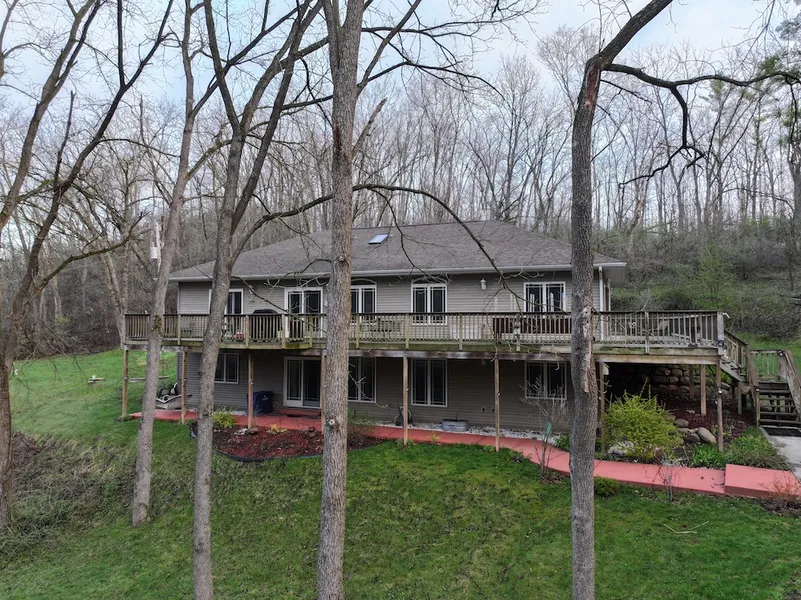 Settle into this hidden gem of a home tucked away on a private/wooded 4.02 +/- acre lot in Mt Horeb! Enter into the open concept main level boasting oak hardwood floors, vaulted ceilings with skylights, dual-sided gas fireplace, a formal dining room, laundry/mud room & so much more! The kitchen boasts an oversized quartz island/breakfast bar overlooking the living room and a walkout to the deck. Main level owner's suite has private walkout & ensuite bath with jetted tub & walk-in shower! The amazing finished basement with walkout offers another family/rec room, flex room,3rd/4th bedrooms, and a full bath that are perfect for entertaining. Enjoy sitting outside on your wrap-around deck or your front/back patios.There are endless opportunities across 4.02 +/acres of pristine private land, including hunting, riding ATVs, and more. Store your toys in the newly installed one-car garage, too! Deer trails wind through the woods, and many other animals call it home. Don't miss out on this exceptional property, a short drive to Madison. Embrace the freedom of country living in luxury!