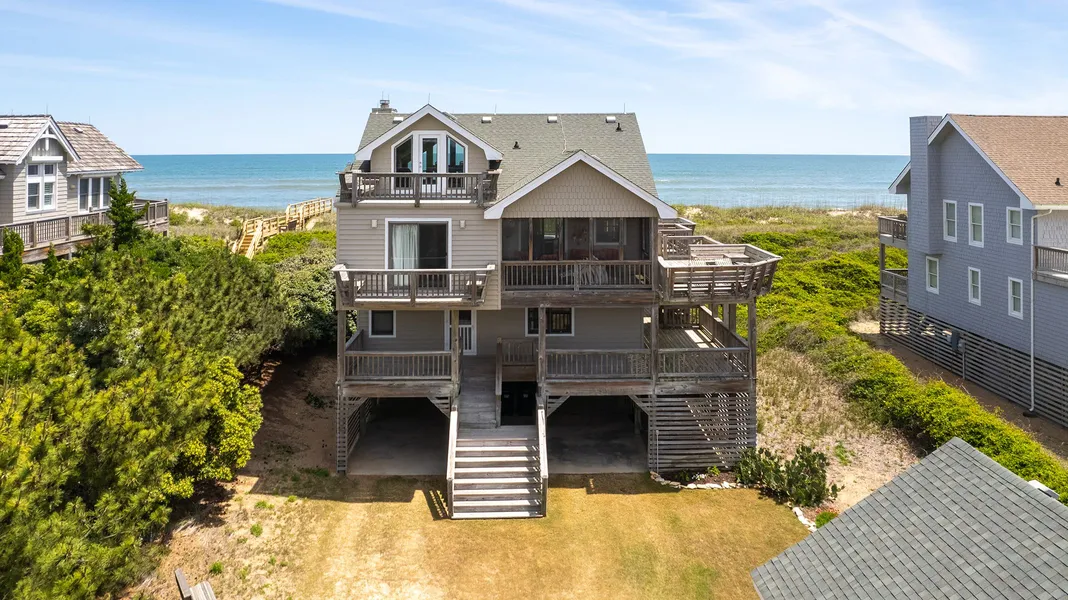 Welcome to your dream oceanfront retreat in the Duck’s highly sought-after Sanderling neighborhood! This charming home offers a serene and private setting with stunning ocean views and direct beach access. Upon entering the first floor (mid-level), you'll find two spacious bedrooms that share a well-appointed bathroom featuring a tub and shower combination along with a double vanity sink, ensuring comfort and convenience for guests or family members. An additional bedroom on this level offers picturesque views of the dunes and access to the outside deck to enjoy the ocean air and glorious morning sunrise. This bedroom boasts an en suite bathroom with a separate tub, shower, and a large vanity, providing a private retreat for relaxation. Ascending the charming winding staircase to the second floor, you are greeted by a wonderfully open main living space. The living room exudes warmth wi...