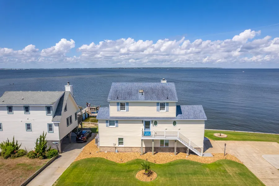 Experience the best of waterfront living in this stunning 4-bedroom, 3.5-bath single-family home in Nags Head on the Outer Banks. Nestled on the Roanoke Sound with 135’ of private waterfront sitting on a double lot. This home offers major water views from every room and wall to wall windows. The remodeled kitchen boasts granite countertops and stainless appliances, while the primary bath features a beautiful custom tile shower. Enjoy a new hot tub on the shaded patio, a private dock with boat lift and kayak launch. The lush yard with irrigation, a wood burning fireplace, and open living/dining area make this home perfect for relaxation and entertainment. Three levels of decking and outdoor living space looking over the water capture the sunsets daily! The home includes 1 king ensuite on the main level, 2 large bedrooms on the top level with Jack & Jill bath and 1 ensuite on the ground le...