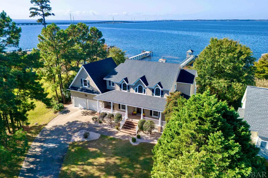 Sunsets & sensational water views from nearly every room steal the show imploring a state of instant tranquility from this beautifully-maintained coastal home. Located in one of the most sought-after gated communities this 1.25 acre parcel features a .10 mile meandering drive through lush peaceful landscape perched in subtle seclusion on the beautiful Currituck Sound. A chandelier-graced vaulted foyer immediately captivates with water views and the Great Room's wall of windows welcome you to a gracious flow of living spaces. A formal Dining room, lovely home office and open-concept floor-plan with eat-in Kitchen and counter dining spaces accommodate a large family and entertaining with ease. Take solace in single-floor living with special features abound such as cathedral ceilings, gleaming hardwood floors, cozy gas fireplace, custom cabinetry wet bar, powder bath and a recently renovated Primary bedroom suite with gorgeous ceramic-tiled shower and soaking tub. You'll wake to water views with access to expansive waterfront decking. Kitchen features custom maple cabinetry, granite countertops, double ovens, countertop range with Jenn-Air grill, two center islands, walk-in pantry, table and counter dining and smartly re-imagined refreshment area with new refrigerator, wine cooler and wine rack grace the main floor. You'll cherish morning coffee and sip on evening beverages from special niche spaces like the perfect enclosed sun porch, welcoming front porch, quaint sound-front nook, large waterfront deck and covered gazebo perched on the 170 ft private pier perfect for sunset and osprey-watching. The home's open essence is carried through on the second floor with 3 additional bedrooms, 2 of which are waterfront with private balconies. One expansive ensuite bedroom with soaking tub, separate tiled shower, immense storage and pull-down attic which spans the length of the house plus two bedrooms with shared jack-and-jill style bath. Another fantastic living feature is the home's additional Recreation Room/Den located over the large 2-car garage. While easily accessible from the home's main Living space, it also offers a private entrance should you choose to fashion it as separate living quarters Suite/Game room/Gym or home office with its own private bath. Exceptional amounts of storage throughout home and in garage with impressive wall configurations, two 600 lb. capacity ceiling-suspended adjustable VERSA RAC units, all which convey with sale. Martin?s Point amenities feature 24/7 security at the gated entrance plus private marina with boat ramp and slips, multiple stocked fish ponds, playgrounds, a waterfront pavilion for hosting gatherings plus boat/trailer storage. Be sure to take advantage of your coveted residency by joining the community's yacht club and take part in the best of coastal offerings with fun social gatherings, kayak outings, sailboat racing, holiday decor contests, and more! This home has a special grace all its own with major hom