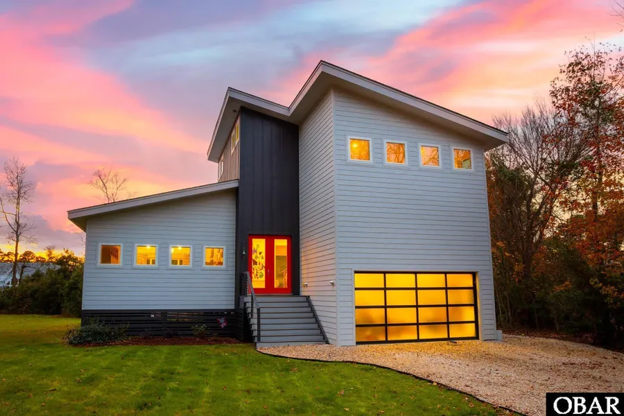 **Unique Opportunity in Southern Shores with Potential for Expansion!**This modern marvel, designed and built by an architectural designer, is tailored specifically for this exceptional lot to optimize privacy, water views, and natural light. The thoughtful design maintains trees along the perimeter, creating a serene, private sanctuary. The deck follows the waterline, forming intriguing angles and giving the illusion of floating over the water. With 10' plus ceilings on the ground floor and a ground floor master suite, this home offers spacious, accessible living in a lofty, contemporary style. The 8' tall by 12' wide doors facing the water provide expansive views, bringing the beauty of the outdoors inside. Located in Southern Shores, this home is in an ideal setting, within walking distance to Kitty Hawk Elementary and across from the 17th hole at Duck Woods Country Club. It is conveniently close to local grocery stores and offers quick access to Virginia. Beach and sound accesses are also nearby, making it perfect for enjoying the coastal lifestyle.The exterior features a large triangular-shaped lot on a cul-de-sac with a new gravel drive and a recently painted Trek deck on the front porch and wood deck on the back porch. The house boasts 2' overhangs, new lattice, clerestory windows, LP siding, Simonton windows (a combination of awnings and casements), and an 8' tall glass garage door by Amarr. Architectural asphalt shingles by CertainTeed Landmark and cable railing on the decks enhance the home's modern aesthetic. The property sits on a 5-acre freshwater pond, ideal for fishing and bird watching, with sightings of Canadian geese, ducks, Blue Heron, egrets, and osprey. A large exterior deck provides ample space for entertaining, and the outdoor shower with teak decking is a delightful feature. The tree-lined lot offers almost complete privacy during the summer months, and there is room to build an ADU, approved by Dare County. Raised garden beds add to the exteriors charm. Inside, the scrupulous attention to detail is evident, as the entire property has been meticulously constructed using the finest materials and finishes, showcasing a modern elegance that will leave a lasting impression. Enter the front door and be greeted by breathtaking pond views. The open-concept arrangement offers a harmonious flow that maximizes the gathering space and captures the essence of indoor-outdoor living making it the perfect venue for entertaining. The living room boasts calming water views with a downstairs that's wheel chair accessible. Off the great room is a generous sundeck with outdoor seating and stunning water vistas. Introducing the ultimate chef's dream kitchen! The kitchen includes cherry cabinets with a gray wash, custom built-ins, a new dishwasher and range, a solid cherry floating shelf, and custom concrete countertops. The dining room has a solid cherry countertop, and all recessed lighting throughout the home are LEDs. Also on this level is
