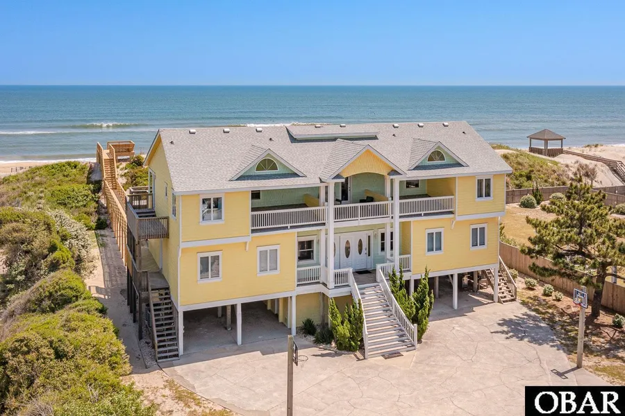 Perched on a rare and expansive 35,000 sq. ft. oceanfront lot with an impressive 100 feet of shoreline, this beautifully remodeled home offers 5,432 sq. ft. of elevated coastal living. Designed to capture sweeping ocean views from every floor, the residence features eight bedroomsincluding six generous en-suite primaries, two bunk roomsand eight full bathrooms, blending comfort, space, and style in a truly one-of-a-kind setting. Lovingly maintained and turnkey, the home shows exceptionally well. Designed with coastal resilience in mind, the structure is fully elevated with no ground-level living space, minimizing the risk of moisture retention and water intrusion often associated with slab foundations. Built with true beach-home integrity, it reflects smart planning for long-term durability, comfort, and peace of mind in an oceanfront environment. The ground level features a spacious dry entry with ample storage and elevator access to the top floor. The mid-level offers two mirrored wings, each with two primary suites and a bunk room, plus access to oceanfront decks and stairways leading to the pool and parking areas. A large game room with pool table and TV, a laundry room with deck access, and a covered porch facing the ocean complete this level. The top floor showcases a dramatic living room framed by floor-to-ceiling windows, double sliders, and a 78-foot oceanfront deck that spans the entire length of the homeperfect for entertaining and soaking in panoramic views. Adjacent to the living room is a granite bar area, multiple sitting spaces, and a spacious primary suite featuring a newly updated tile shower in 2025 (not reflected in pictures). Both top-floor bathrooms have been remodeled with stylish tile finishes, and all carpeting throughout the home was replaced in 2025. The expansive kitchen and dining area is a true showpiece, designed to accommodate large gatherings. It features stunning white italian marbled granite countertops, double ranges/ovens, a prep sink, stainless steel appliances, and generous counter space for effortless entertaining. The space is wrapped in wall-to-wall windows and finished in soft seaside coastal tones that reflect the beauty of its oceanfront setting. Another primary suite is located just off the kitchen, and stairs at the end of the hall lead directly to the oceanfront pool and the front of the home. Exterior features include a fiberglass in-ground pool, hot tub, volleyball area, fish cleaning station, outdoor shower and commode, and a newly built dune deck and walkway to the beach (2024). There is covered parking for four vehicles and additional space in front of the home. The property has new siding on three sides, a new roof installed in 2018. Recent upgrades include new stainless steel kitchen appliances, interior paint, new furniture throughout, new mattresses (May 2025), remodeled bathrooms (two mid-level in 2024 and two top-level in 2025), new carpet (May 2025). 4 HVAC units at the property: 1 was c