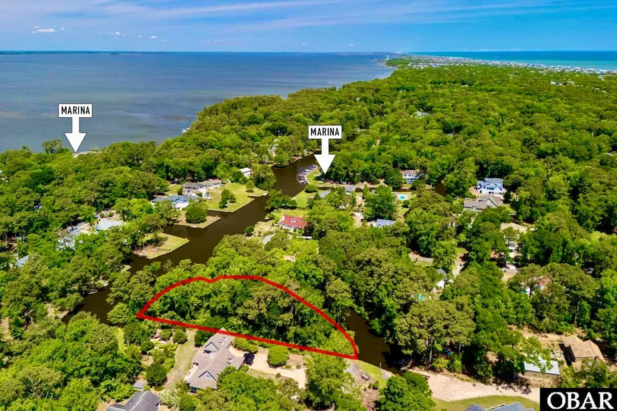 Sensational 1 acre+ homesite in prime location of Southern Shores offering truly unique waterfront living. Surrounded by water on 3 sides the stage is set for the home of your dreams where you'll be bathed in privacy while you unwind to west-facing views and spectacular sunset skies. Nestled at the end of a quiet cul-de-sac just south of the Loblolly Marina with fast access to Ginguite Creek and the Currituck Sound where you'll be boating, fishing, kayaking, bird-watching, paddle boarding, visiting restaurants by water and more in mere minutes! Nice elevation adorned with beautiful mature trees await custom home build in the highly coveted community complete with gracious amenities; 3 private marinas, watercraft launches, a private soundfront beach, playgrounds, picnic areas, pickleball/tennis/bocce ball/basketball courts, soccer field, multi-use paths and handicap accessible beach acces...