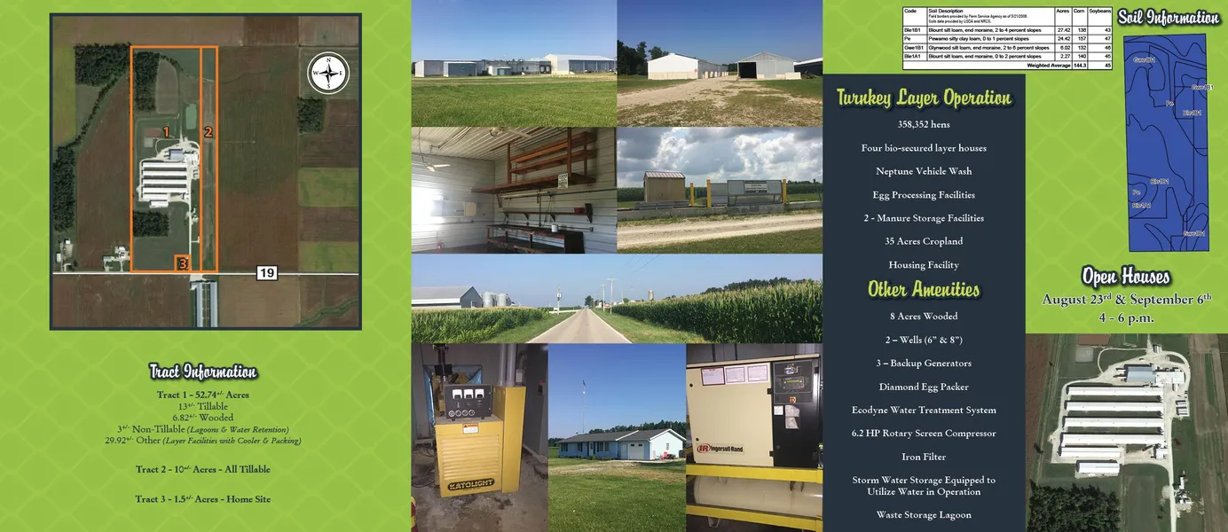 Building Description Turnkey Layer Operation: Four bio-secured layer houses; Neptune vehicle wash; Egg Processing facilities; (2) Manure Storage facilities; (1) Housing Facilities