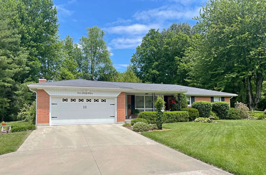 Lovely brick ranch on 1.912 acres +/- featuring open living, dining, and kitchen with custom cabinets & gas log fireplace, family room, 3 bedrooms, 2 baths, main level laundry, sunroom, partial basement with large rec room, storage, and mechanical room, plus 2-car attached garage and an in-ground pool.