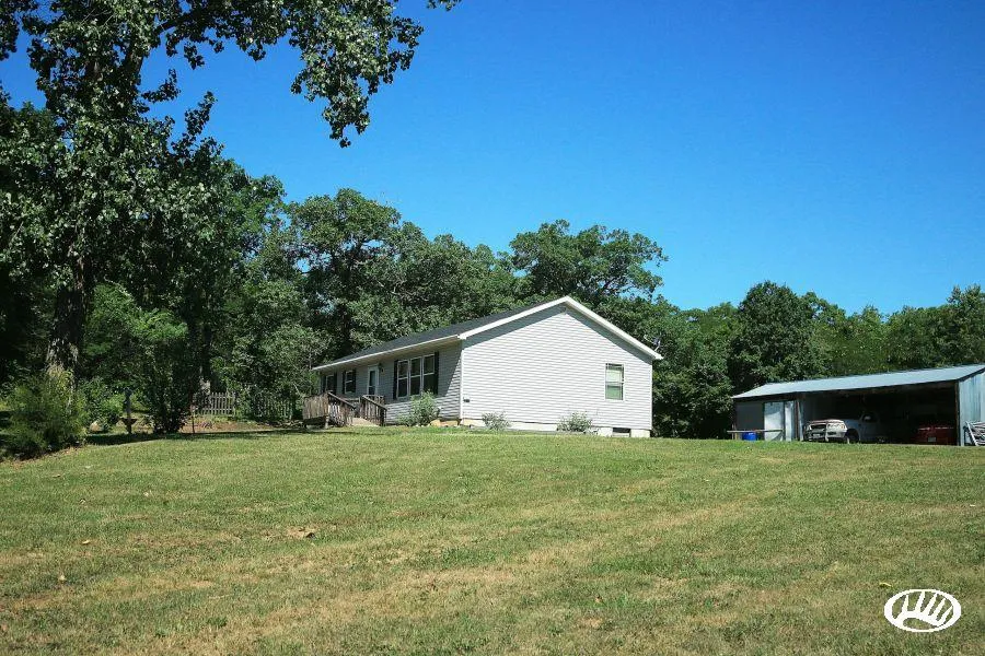Country living on beautiful wooded acreage right off the blacktop. This well-maintained two bedroom, two bathroom modular home was built in 2008 with an open floor plan and the comfort and convenience of having everything on one floor. An oversized living room adjoins an open kitchen creating a “welcome home” feeling as soon as you step inside. The yard feels like a park with fruit trees, flower beds, vegetable gardens, evergreen screen along the road, and towering oaks to give privacy and shade. Just outside the home sits a shed with a carport for two cars, plus storage space, and there’s also a tool shed out back for storing yard equipment. The scenic land surrounding the home is almost entirely wooded. Timber types and age classes vary widely from majestic oaks to brushy thickets, and there are even some walnuts along the creek bed. The terrain also varies from high ridges to the seasonal creek below. The habitat is excellent for the native wildlife and deer are frequently seen in the yard as they move from bedding in the timber towards feeding zones in neighboring crop fields.