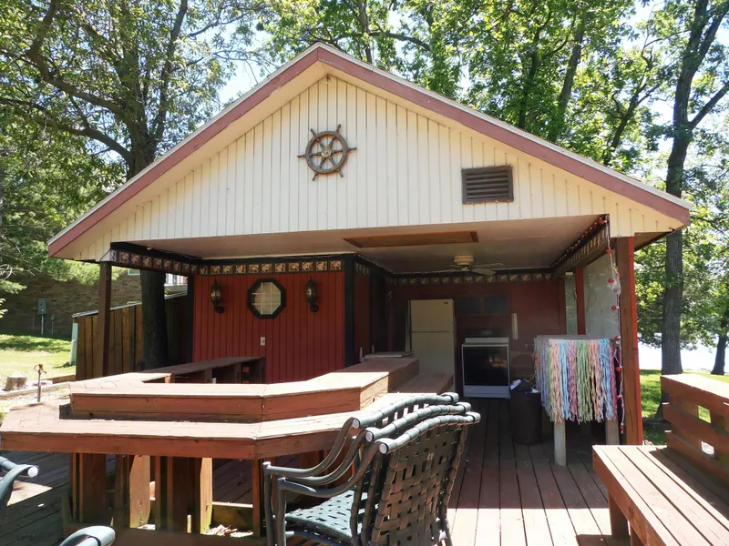 Very nice lot with large deck that has a shelter house with lean to, large U shaped bar, stove and refrigerator, and a big brick smoker. The 1 slip dock has a boat lift, swim dock and a small private sand beach. Located in a cove close to beach 2.