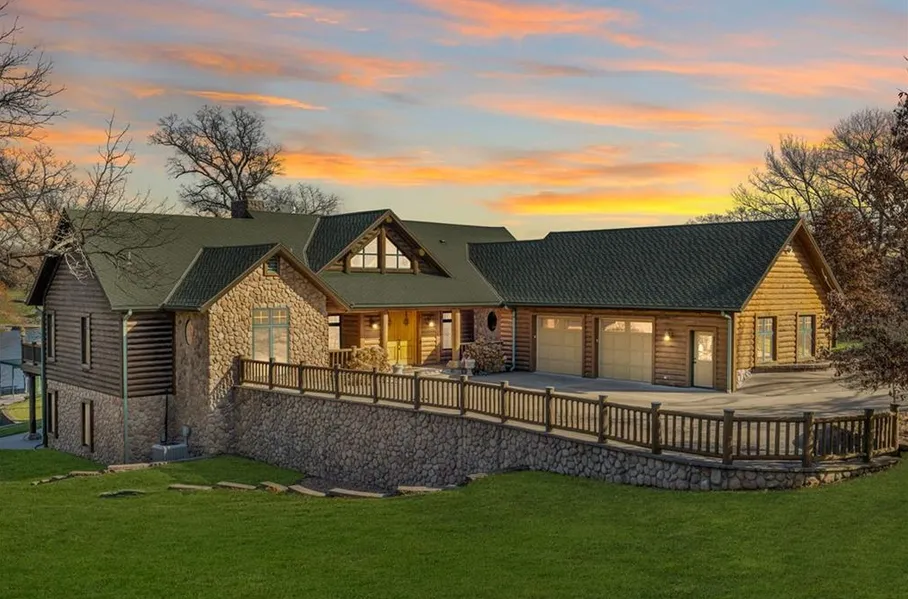 This architectural masterpiece comes completely furnished and is framed with sculpted half logs, offering unparalleled rustic elegance both inside and out. The main floor features a grand entryway that opens into a magnificent great room. This space includes a fireplace, exposed beams, soaring vaulted ceiling, and an expansive wall of windows. The unique design floods the room with natural light and frames breathtaking views of the lake. The kitchen is a showstopper, featuring a massive island adorned with rich dark granite, accented by two stunning log posts stretching to the ceiling. The lavish primary suite is a sanctuary of its own, accessed through a private hallway and boasting a dry bar, sophisticated tray lighting, plenty of windows, and a private patio door that opens to a deck overlooking serene lake views. The main floor also includes two guest suites, each providing luxurious comfort and private access to the deck. Every detail speaks to refinement from the 8-foot doors to the custom cabinets, the meticulously crafted cabinetry and Alder woodwork seen throughout. The home is wired with a premium surround sound system, creating an immersive audio experience. On the lower level, you'll find a climate-controlled wine cellar, a walkout bonus room with a striking glass block wall and cedar-lined closet adding functionality to the lower level's quiet sophistication. Additionally there is a flex room (bunk room/exercise room) adding additional space for guests if needed. The outdoor space is designed for exceptional entertaining, featuring a concrete dock with a lift for effortless lake access and a jet ski port. An expansive patio provides the perfect setting for lounging, completing this extraordinary luxury retreat. Complete with furnishings, and exercise equipment; this home will not disappoint!