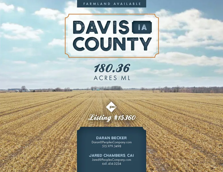 Peoples Company is pleased to present 180.6 acres m/l of prime farmland located just south of West Grove, Iowa in Davis County. This highly tillable farm has 167.69 FSA tillable acres which carries a CSR2 rating of 49.8. The farm is leased for the 2021 crop year at $215 per tillable acre with rent proration dependent on date of closing. The south 39.56 acres m/l on this farm are NHEL while the remaining 128.13 tillable acres m/l are in a 100% corn and bean rotation. It's hard to find a 93% tillable farm with top notch soils and 3/4 mile long rows in Davis County. Take a look at this one! Water and electric are available along the road and normal hook up fees would apply. Please contact the listing agents, Daran Becker or Jared Chambers, for more information.