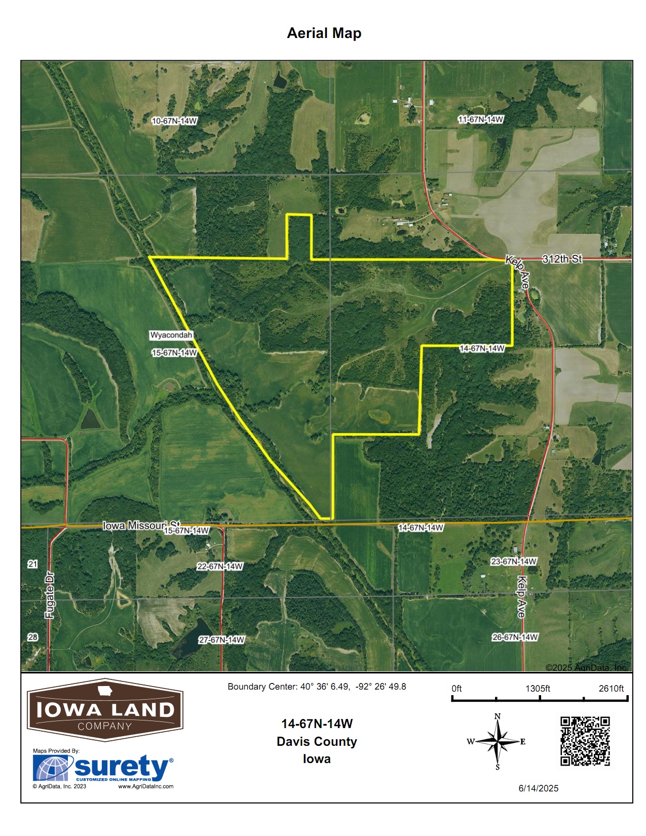 Located In southern Davis County on the Iowa/Missouri border sits a beautiful 264+/- acre farm with an opportunity to invest, live, and hunt in big buck country of southern Iowa. The farm has a mixture of hardwood timber, income, crops on the high ground, crops on the bottom with bedding between and the North Fabius River bordering the entire west side of the farm. The trail system is throughout the farm allowing easy access to all areas making this farm a hunters dream. There is ample room for adding strategically placed food plots for winter food. The topography of this farm sits well, allowing hunters several options to hunt depending on wind direction. The bottom ground would be a fantastic place for late season muzzleloader and offers many pinch points and funnels for hunting the rut. As I toured the farm I saw plenty of signs of deer including old rubs, scrapes and bedding areas that have been used recently. Turkeys are plentiful on this farm! There are 171.84 FSA cropland acres. 83.68 (NHEL) FSA certified cropland acres and currently 100+/- acres being farmed per contract. The CSR2 is 67.5 with an annual income of $21,000. The farm is leased until March 1, 2026.