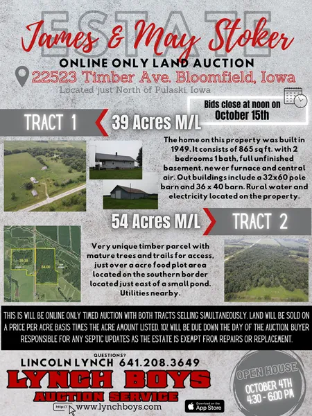 This is will be online only timed auction with both tracts simultaneously remaining open for bidding until no bids are placed on either tract for 5 minutes .Land will be sold on a price per acre basis times the acre amount listed. 10% will be due down the day of the auction. Buyer responsible for any septic updates as the estate is exempt from repairs or replacement.