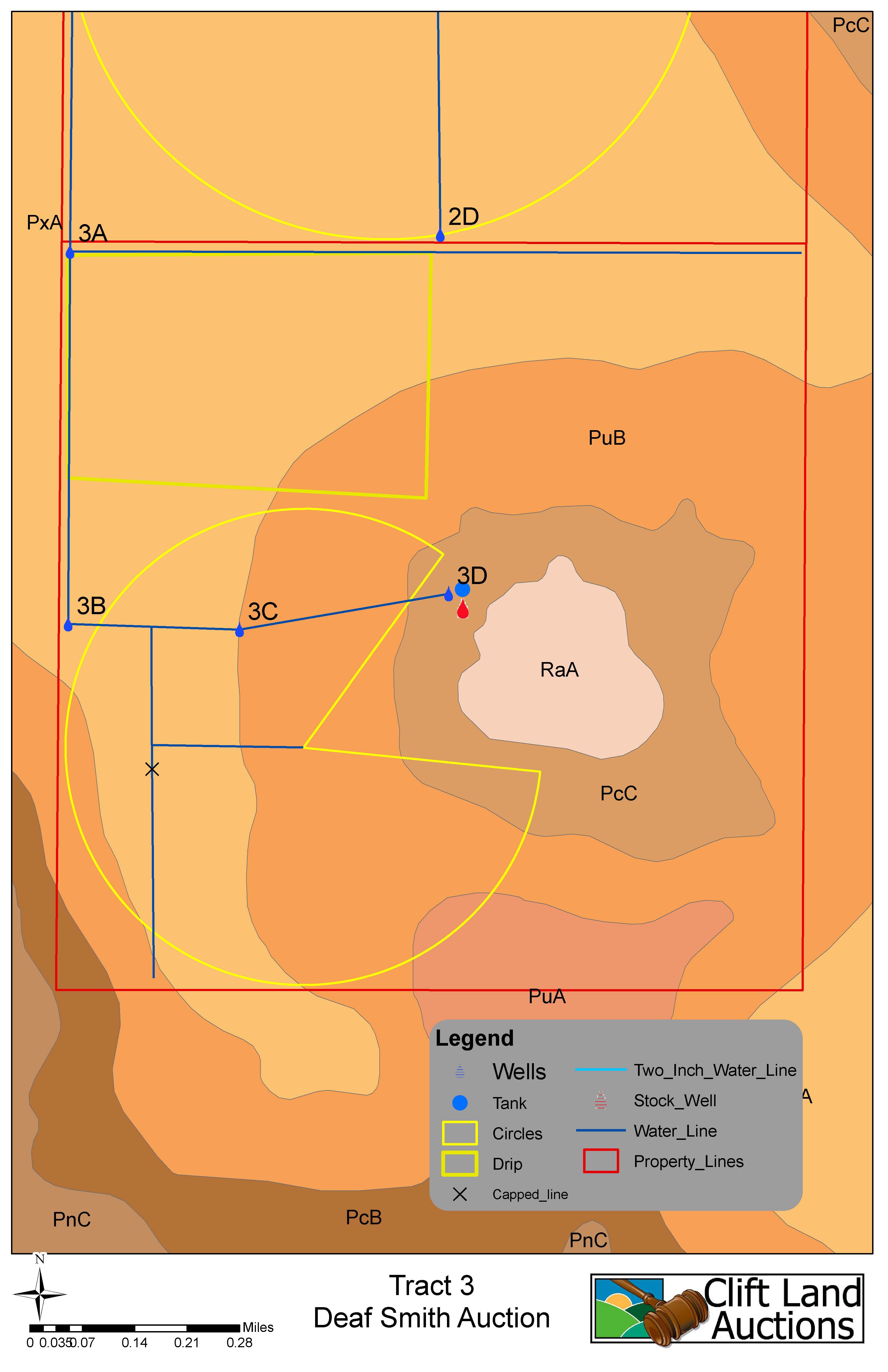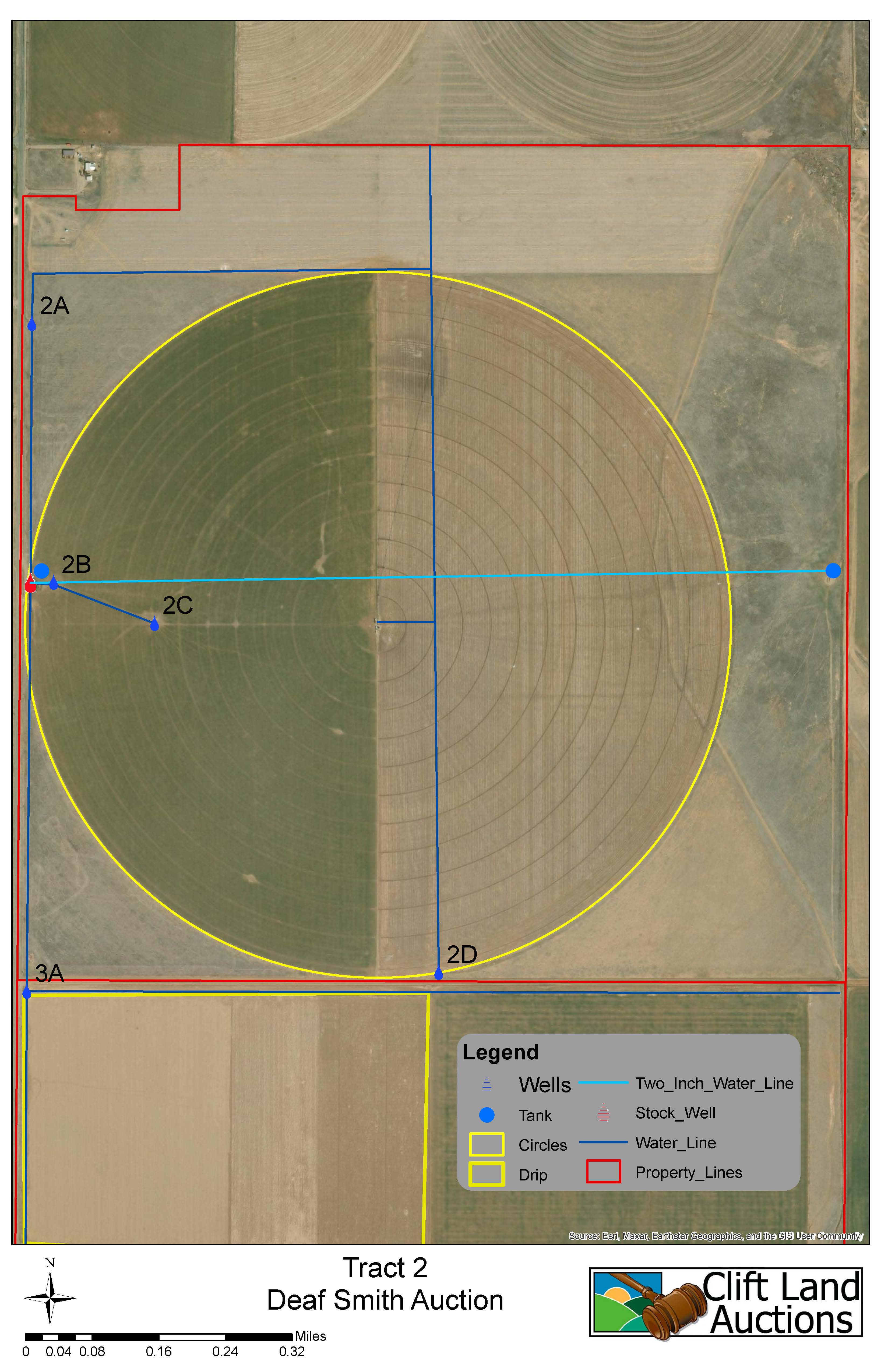 Irrigation water is provided by four submersible wells. Water is disbursed through one 2014 Reinke sprinkler covering 170+/- acres and a 105+/- acre drip irrigation field on 30 tape centers for a total of 275+/- irrigated acres (43% developed). The sprinkler is nozzled for 500 gpm. A water line currently crosses County Road 23 to connect Tracts 2 and 3. The High Plains Underground Water Conservation District flow tested the wells on 9-17-2024 with a result of 258+/- total gpm. Three phase electricity is currently used and accessible to the farm. There is a livestock well and tank near the center of the tract.