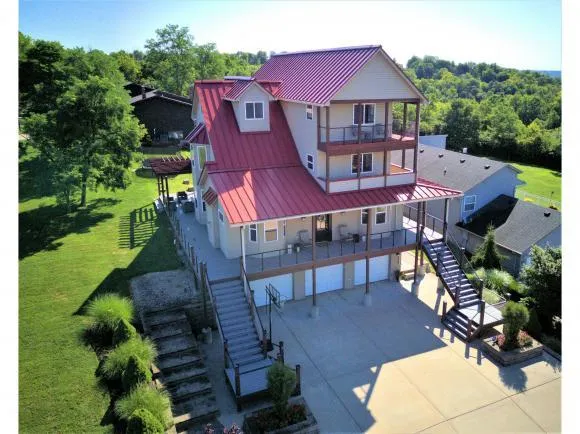 Lake views abound in this unique custom home! Upgrades thru-out! Decks & balconies off every level, plus an elevator for easy access. Custom kitchen features gas cooktop, huge island w/quartz tops, maple cabinets & newer stainless appliances. Open floor plan. Second floor BRs have private balconies & Jack & Jill BA. Luxury Master Suite occupies the entire top floor! Lg laundry off Master could be exercise room, office, craft room or nursery! Full BA on every level. Great Mudroom w/built -ins off garage. Trex steps & wrap around deck on main le