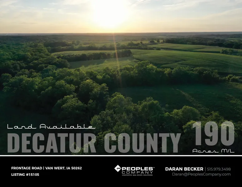 190 acres m/l of highly managed whitetail heaven located in one of the most sought after big buck areas in Iowa. This property is located near some of the biggest names in the industry just west of I35 in Decatur County. There are 124.02 tillable acres with roughly 25 acres currently being cash rented for row crop production. The rest of the tillable acres are in 2 CRP contracts. 9.97 acres are in CP33 at $233.57 per acre until 2025 and 66.56 acres are in CP25 at $112.44 per acre until 2029. There are 3 established clover food plots making this farm hunt ready come fall and a stocked pond loaded with bass, bluegill, and Crappie. The west 40 corners the back side of the 2,167 acre DeKalb Wildlife area with nearly 1600 acres of solid timber. Existing deer stands and box blind are negotiable. Rural water is located on the north east corner of the farm and electric is at the road.