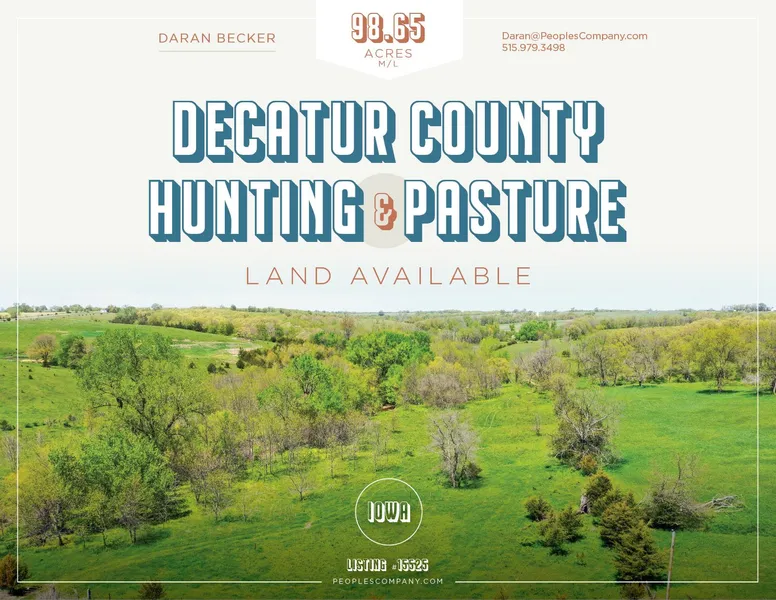 Peoples Company is pleased to present 98.65 m/l acres of excellent hunting/pasture ground located in the most sought after part of Decatur County, Iowa. The property includes a heavily timbered draw with a tree lined creek running north to south through the entire farm. The creek is a natural travel corridor for big bucks moving to the large timber tracts in every direction. There are three ponds on the property with two that are piped for, and include cattle waterers. The area along the creek has multiple food plot locations and has been planted to trees that are currently 15 to 20 foot tall. There are 38.32 acres that are considered FSA tillable and could be put back into row crop production for added income. The area is known to produce giant whitetail bucks with highly managed farms owned by some of the biggest names in the industry located in every direction. If you are looking for hunting ground this property is a blank slate with loads of potential. Come take a look!