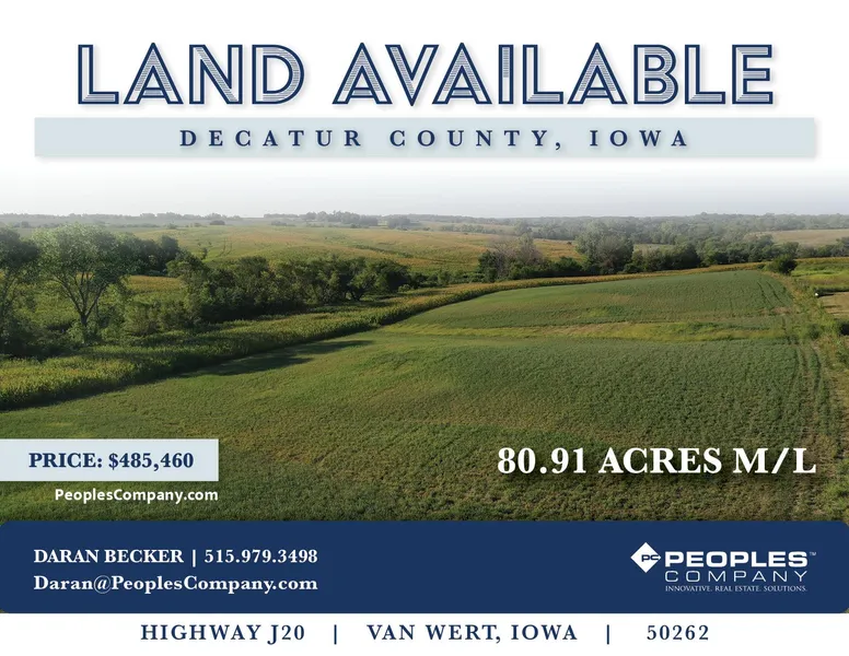 Peoples Company is pleased to present 80.91 acres located on Hwy J20 less than a 1/4mile off of Interstate 35 in Decatur County, Iowa. Timbered draws, two ponds, and a paved road makes this the ideal location to build your dream home and start your farming operation. The farm boasts 66.51 cropland acres with a CSR2 of 30.8. The tillable acres were planted to corn and alfalfa hay in 2022 and are generating $10,000 to 12,000 in annual rent income. The farm is open for 2023. There are plenty of recreational opportunities with a large stocked pond filled with bass, bluegill, and catfish. If you like to hunt, the crop fields, rolling hills, and timbered draws create the perfect pinch point for all the whitetail deer traveling through the neighborhood and provide plenty of border for the pheasant and quail population. There are also several sites for a much larger pond if so desired. All this ...