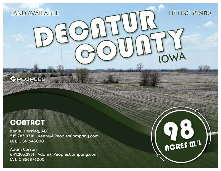 Highly productive Decatur County farmland. The property is located in northern Decatur County and just off Interstate 35. This farm offers an opportunity for both farmers and investors, with productive soils and is nearly 90% tillable. In addition to being a worthy investment, the location lends itself to easy interstate access with road frontage on two sides. The farm has been well cared for and owner operated for a number of years. A survey will be done prior to closing to determine the exact acres.