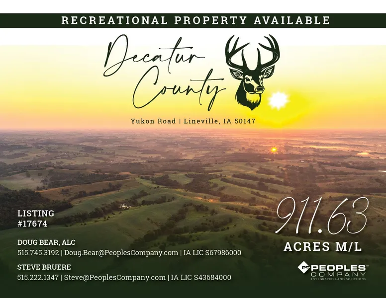 Peoples Company is thrilled to introduce this exceptional hunter's retreat, a property you dont want to miss! Rarely does a contiguous property of this size come to market in southeastern Decatur County, Iowa. This secluded property is home to a vast array of wild game including deer, turkey, waterfowl, rabbit, squirrel, raccoon, coyote, fox, and bobcat. Steel Creek runs along the west border, Hog Creek traverses the northern section, and eight ponds are dotted throughout, providing ample year-round water sources for both cattle and wildlife. The balance of the property consists of mature timber and heavy cover perfect for growing and holding large Boone and Crockett trophy deer. The topography and various timber draws create numerous pinch points giving you plenty of opportunities for close encounters with wildlife. Seasoned deer hunters will appreciate the eastern road frontage with ea...