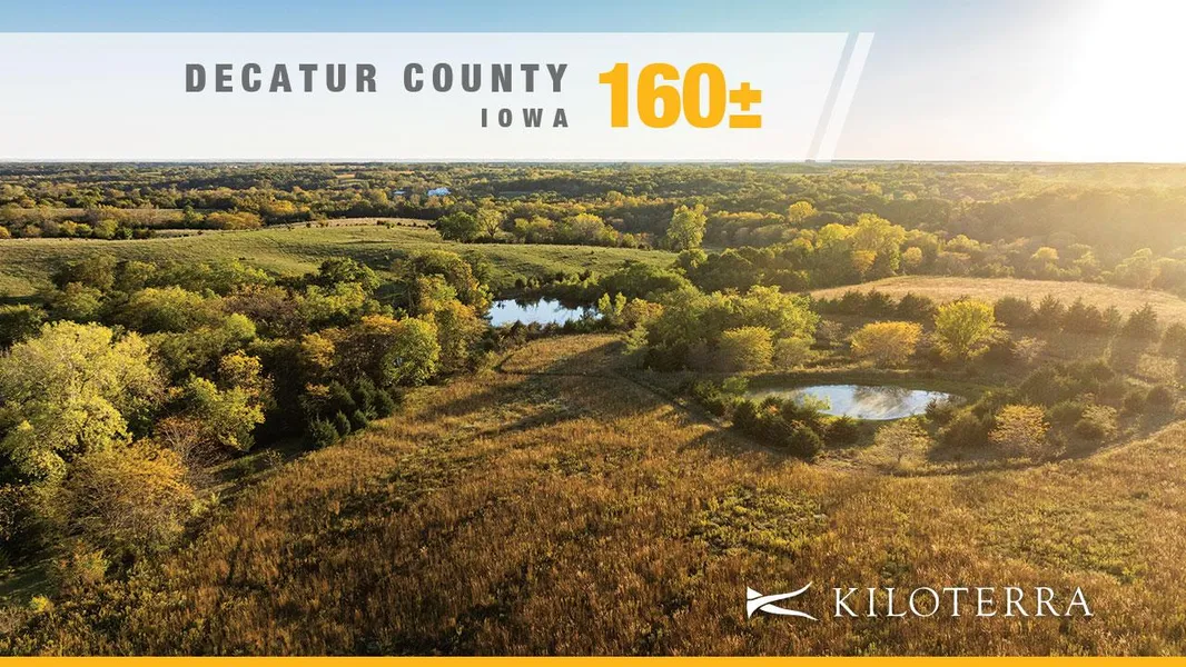 KILOTERRA is honored to offer this 160-acre Southern Iowa Hunting farm in Decatur County. Situated on a hard-surfaced road (Lineville Rd.) just NW of Lineville, Iowa this farm offers high end recreation value and exceptional building sites overlooking the multiple ponds.